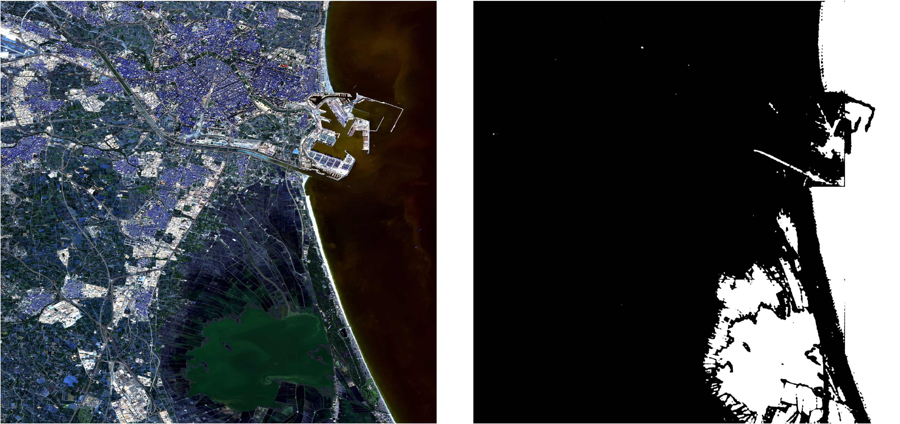 main()Below is an example of the input and the expected output. The input image (left) is a satellite picture of Valencia, Spain during the 2024 flood. The output image (right) shows the areas predicted as flooded (in white) by the Prithvi model.
