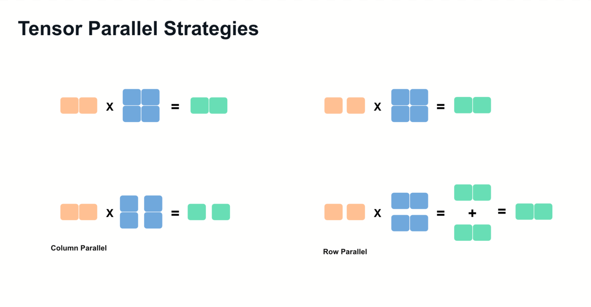 2. Row Parallelism: Splitting matrices along rows, summing partial results post-computation.