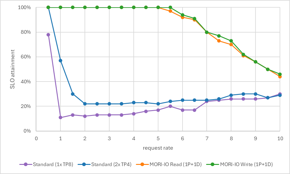 • Standard serving (1× TP8): Shows ITL violations from low request rates, dominating across all tested request rates. Achieves 26/100 at rate = 8.