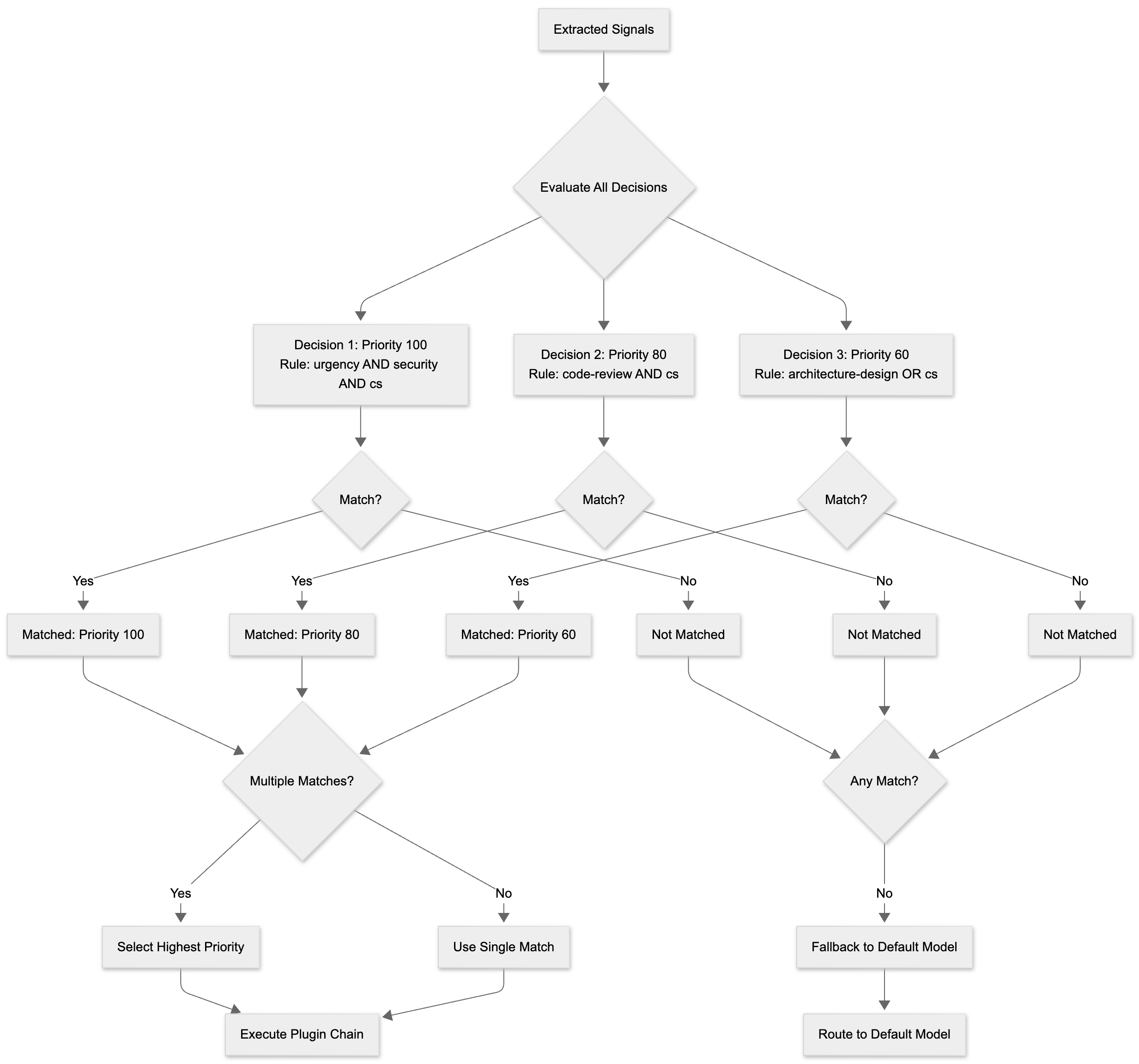 Each decision can have unique model selection, reasoning configuration, and plugin chains—enabling fine-grained control at scale.