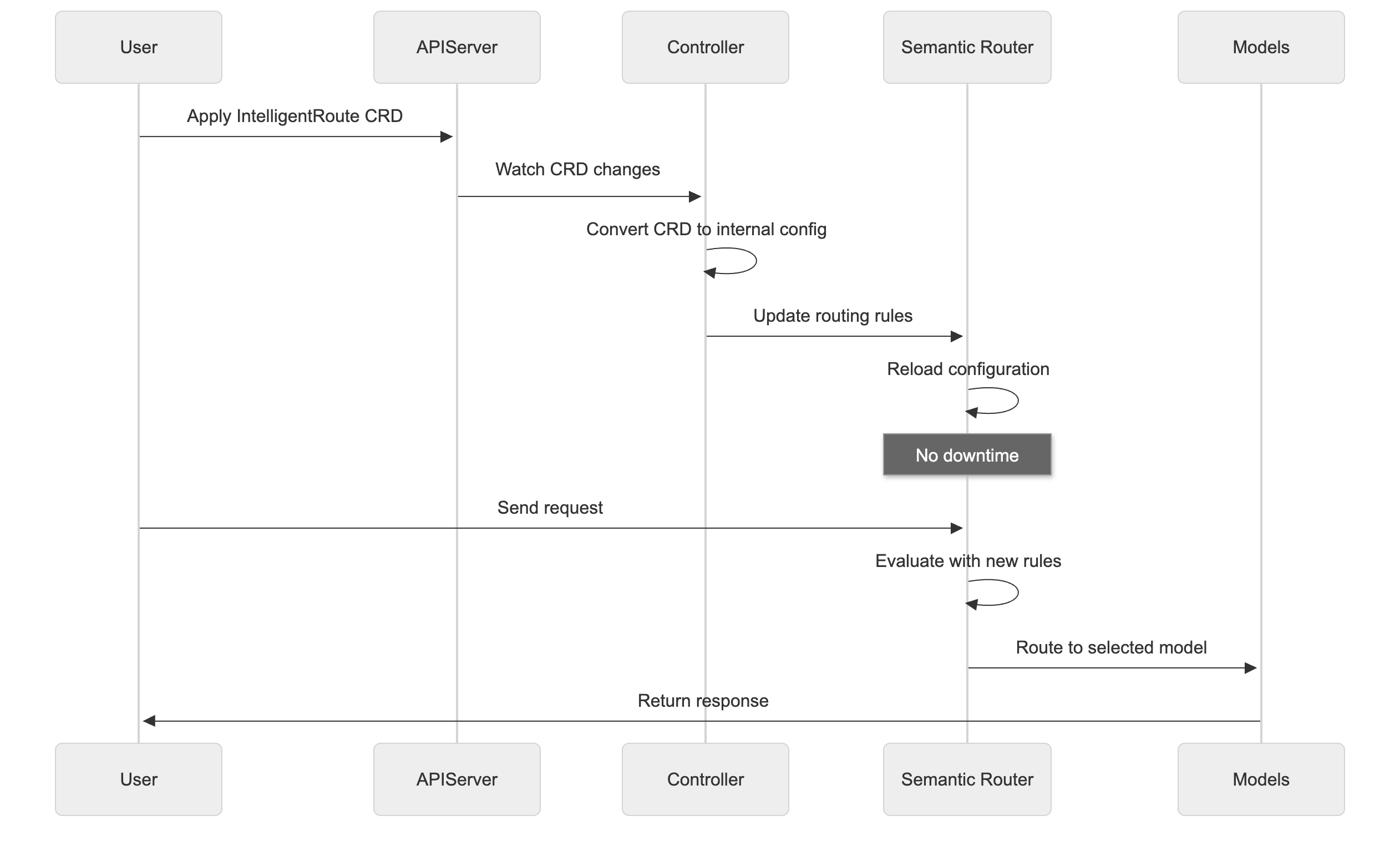 The Signal-Decision Architecture is designed for cloud-native environments with two Custom Resource Definitions (CRDs):