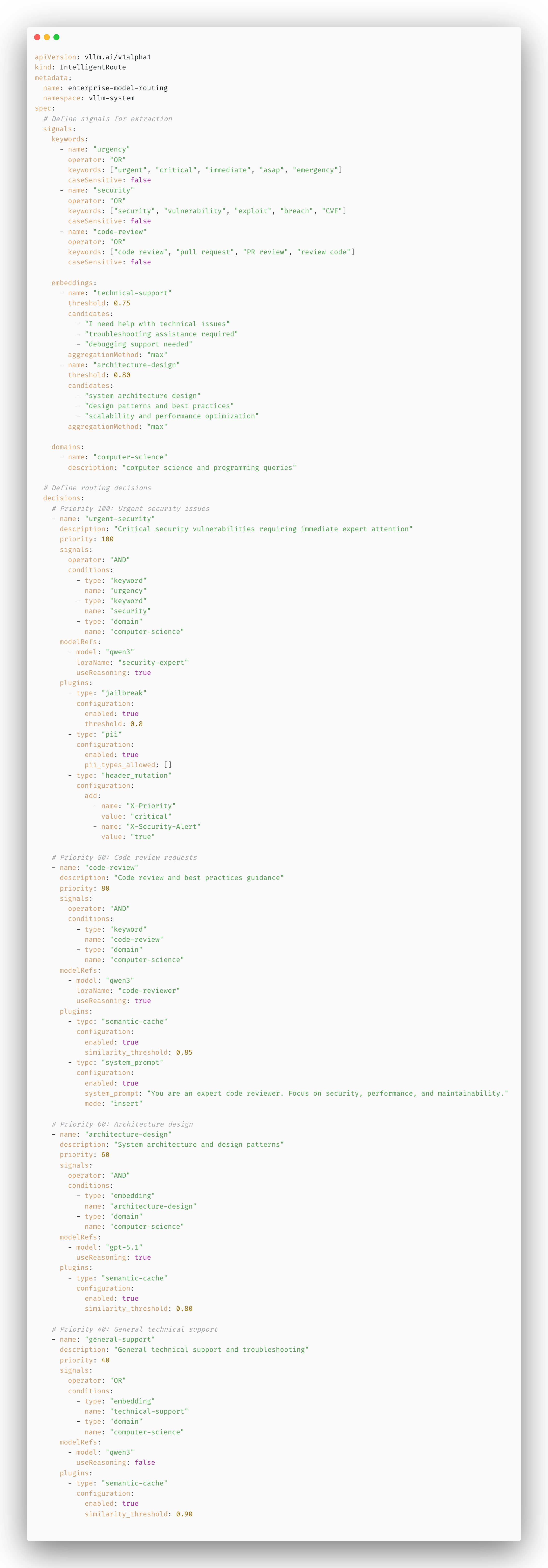 By combining all three, the Signal-Decision Architecture captures multiple dimensions of user intent simultaneously, enabling far more sophisticated routing logic than any single signal type could achieve.